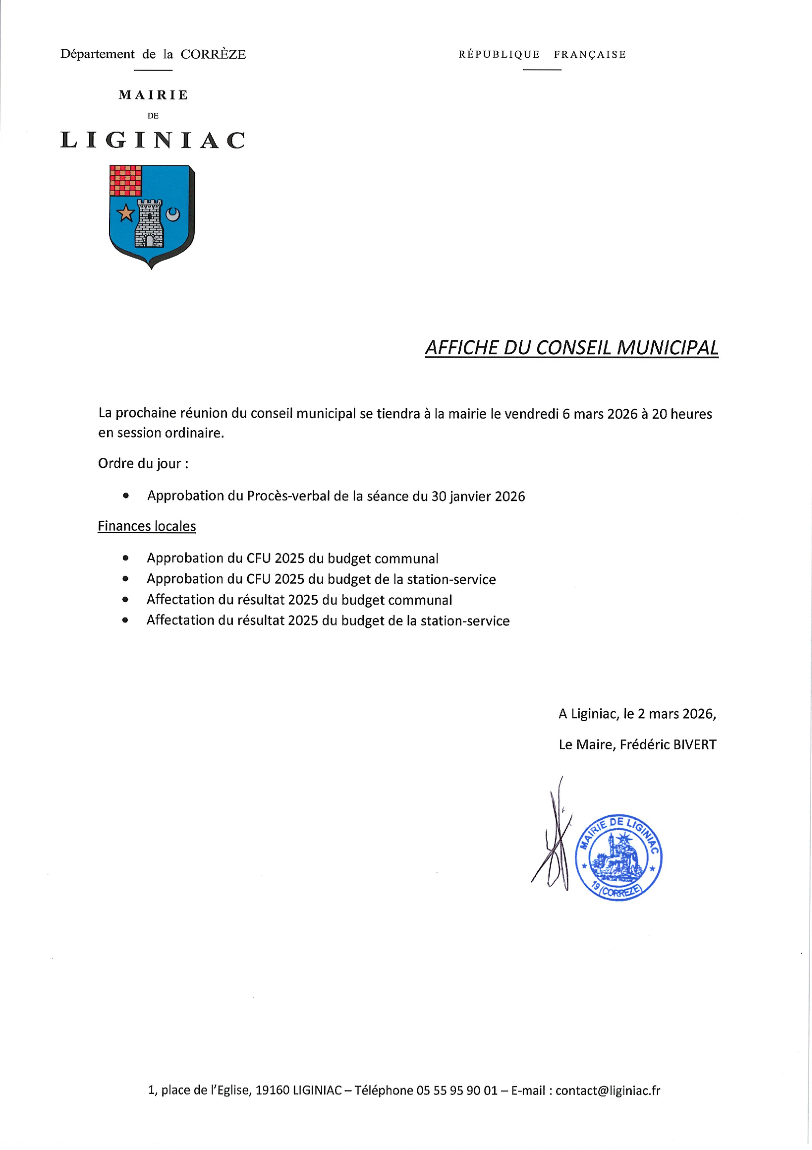 Ordre du jour du Conseil Municipal du 6 mars 2026